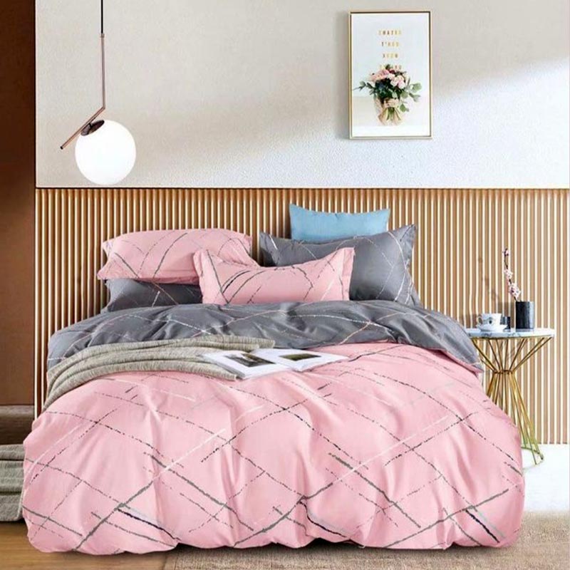Рожевий відтінок у поєднанні з благородним сірим створює затишну та спокійну атмосферу у спальні. Легкий геометричний малюнок виглядає стильно та охайно, не втрачаючи актуальності з часом.